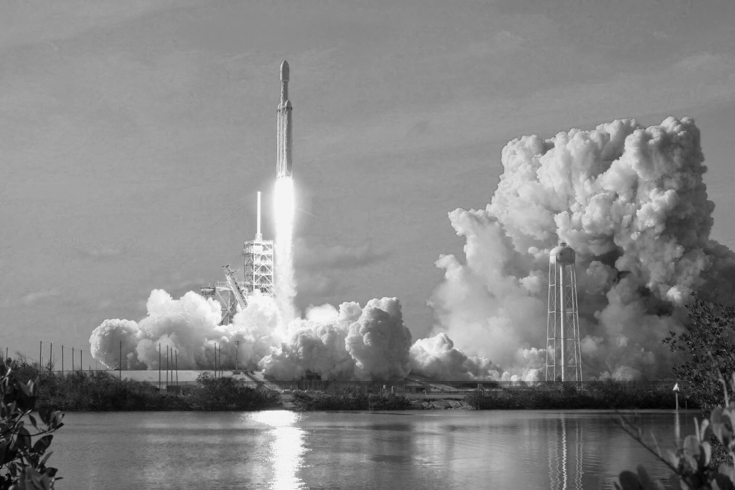 A black and white photo of a rocket launching from a space center, with smoke and bright flames at the base, water in the foreground, and a cloudy sky in the background.